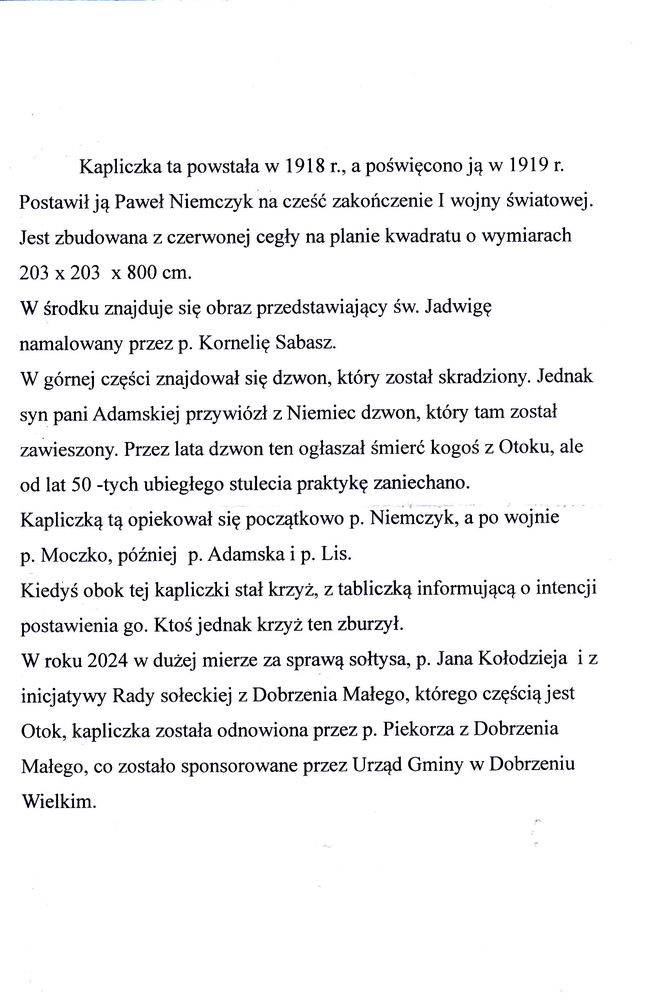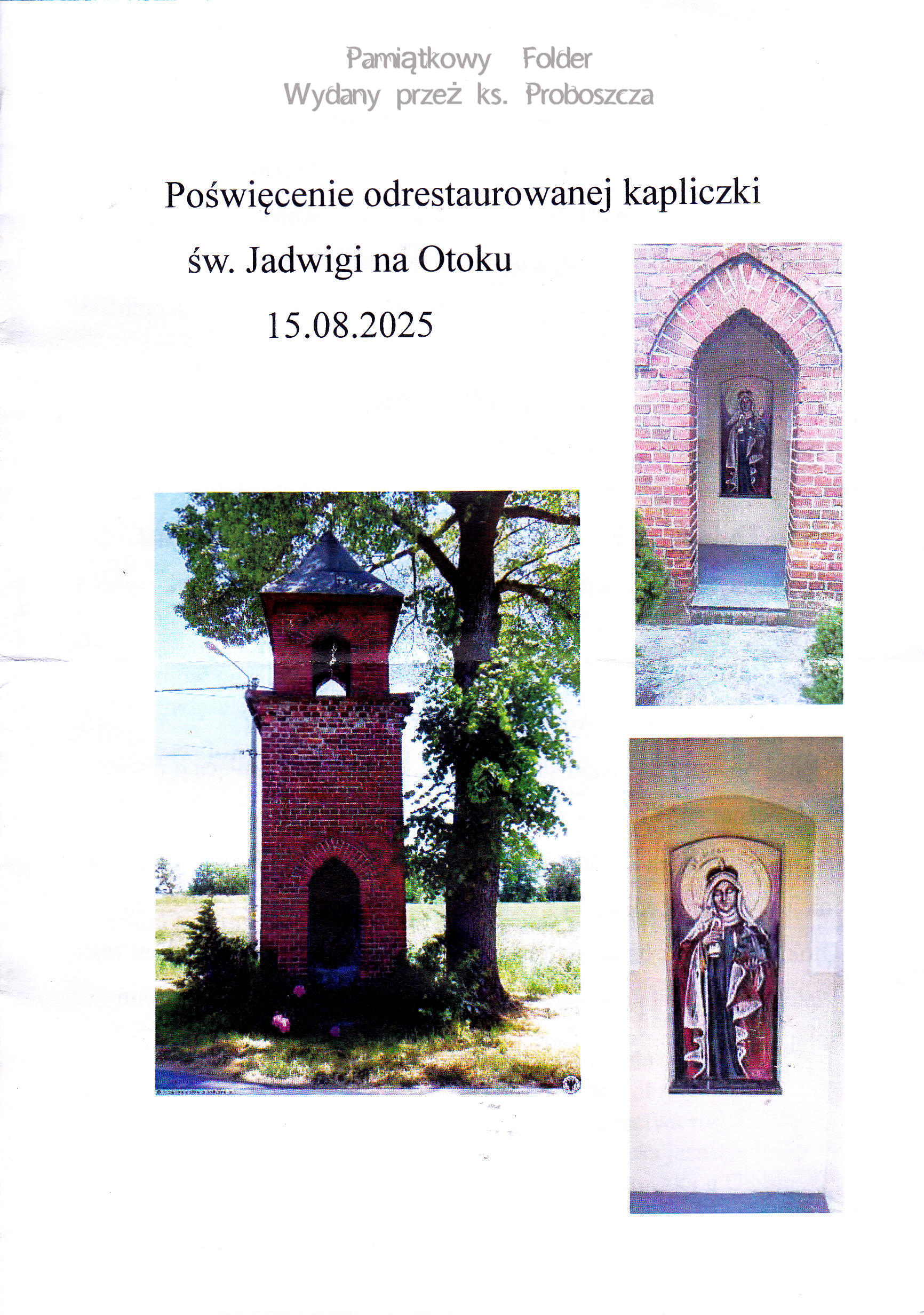 15 sierpnia na Otoku odbyło się poświęcenie odnowionej kapliczki św. Jadwigi. Zebrała się spora grupka ludzi to wyjątkową uroczystość dla tej społeczności należącej do Dobrzenia Małego a mieszczącej się po drugiej stronie rzeki Odry. Na początku ks. proboszcz Jan Polok przedstawił historię kapliczki, potem odbyło się krótkie nabożeństwo i nastąpiło poświęcenie kapliczki. Z tej też okazji ks. proboszcz wydał krótki folder z historią kapliczki. Na koniec było się spotkanie wszystkich mieszkańców i przybyłych przy kawie i kołoczu śląskim. Odnowienie tej kapliczki odbyło się dzięki staraniu naszego sołtysa Jana Kołodzieja i Urzędu Gminy który współfinansował przedsięwzięcie.